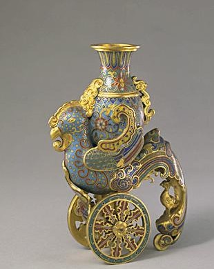 掐丝珐琅天鸡尊,清乾隆,通高18.9cm,身长13.4cm,口径4.5cm。