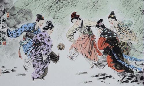 蹴鞠又名“蹋鞠”、“蹴球”、“蹴圆”、“筑球”、“踢圆”等,“蹴”即用脚踢,“鞠”系皮制的球,“蹴鞠”就是用脚踢球,它是中国一项古老的体育运动,有直接对抗、间接对抗和白打三种形式。