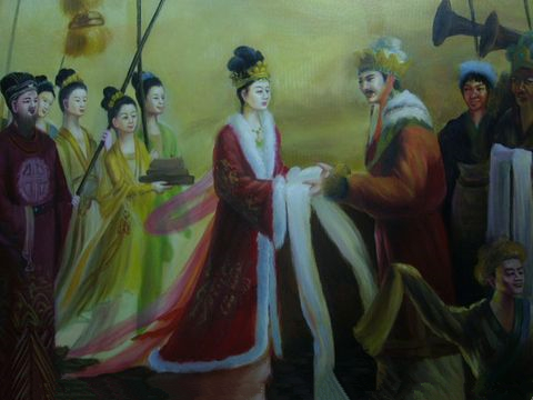 641年3月2日 (唐贞观十五年正月十五日) 唐太宗派礼部尚书、江夏王李道宗护送文成公主,经过青海入吐蕃与松赞干布完婚。松赞干布亲迎到青海,并在逻些(今拉萨),特地修筑了宫城,作为寝宫居住。完婚的那天,松赞干布特地换了唐服,设了仿唐仪仗,按唐人的礼仪,祭天地,夫妻双拜,然后进入洞房。