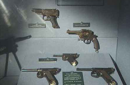 博物馆中还陈列着很多设计奇巧的特种枪支。有的枪管前端有一个消声器,开枪时发出的声音很小,因此被称为无声手枪。还有一把酷似烟盒的特种手枪,一次可装7发子弹。钢笔枪装饰成世界名笔的外形,插在上衣口袋里,谁也不会想到那会是杀人武器。还有一种竹节式手杖枪,这种枪外形上与一般竹节式手杖没什么差别,但它却是一种威力很大的特种枪,几十米内足以使人毙命。