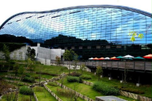 九州国立博物馆为一个160m乘80m长方形的半圆柱体形。屋顶最高处达36m,其宽敞的空间,足以容纳下一个足球场,整个建筑物极具现代动感。 巨大的屋盖与周围的山峦相融合,呈现出柔和优美的曲线,状似波浪,象征着新时代日本的文化交流将在九州开启新的篇章。光线透过玻璃幕墙,映照出周围的山峦。因采用双层玻璃构造,无论春夏秋冬馆内都能保持舒适的环境。