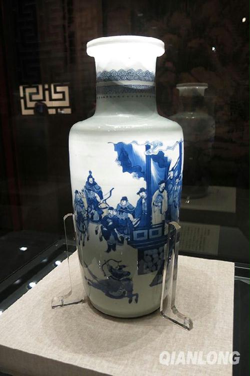 青花铜雀台比武图棒槌瓶。器底白釉、无款。千龙网实习记者 张嘉玉 摄