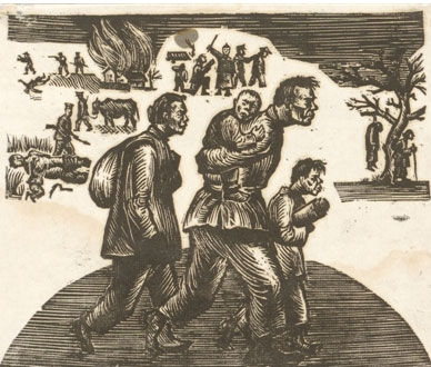 日寇入侵中国之后,到处大肆烧杀抢掠,广大人民流离失所。胡风收藏的抗战木刻中,便有不少作品反映了广大人民在日寇铁蹄之下的苦难生活。如刘岘的《侵略者来了》,前景突出刻画了一个面目狰狞的日本浪人形象,背景以几间正在燃烧的房屋来突出侵略者的暴行,主题鲜明。江丰的《何处是家》也是这类题材的代表作——以日寇枪杀农民、抢夺耕牛、烧毁房屋等场面为背景,突出前景中不堪忍受日寇暴行、不得不背井离乡的一家四口的困苦,日寇的罪行在强烈的黑白对比中昭然若揭。