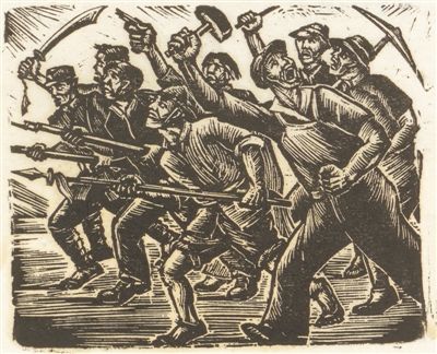 抗战中,广大群众不仅参加武装抗日军事行动,也在敌后方用实际行动支援前线抗战,如陈叔亮的《石印工人》刻画了印刷工人印刷宣传品的场景。为应对日寇的“三光”政策和经济封锁,广大抗日军民还积极开展生产,为抗战的胜利打下了物质基础。如江丰的《开荒》、阎素的《武装保卫春耕》、安林的《保卫收获》等都是这类表现八路军开荒、农民武装保卫收获的主题。还有焦心河的《为抗日将士做军鞋》、李桦的《耕耘》、力群的《给群众修纺车》等,就艺术性而言,这几幅木刻中的人物形象均已带有鲜明的民族风格。
