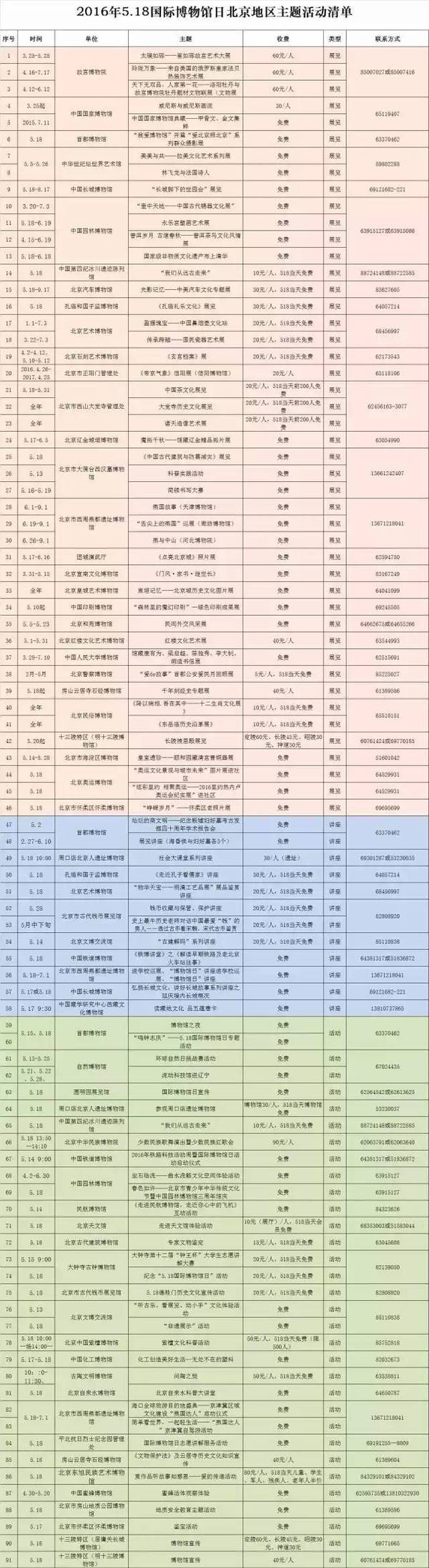 5月18日,第40个国际博物馆日到来之际,由北京市文物局、北京博物馆学会主办,北京地区各博物馆参与的2016年“5.18国际博物馆日”主题系列活动,目前,北京地区各种类型的博物馆已有170余家,其中多家国有及非国有博物馆当日向市民免费开放。不完全统计,今年5月18日对市民免费开放的博物馆多达97家,其中包括国有及非国有博物馆,覆盖面遍及整个北京城。