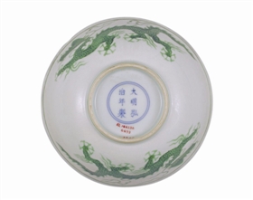 明弘治白釉刻花海水绿彩云龙纹碗