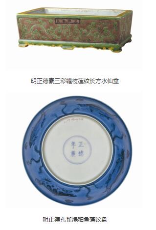 弘治朝御窑瓷器艺术风格延续成化朝御窑瓷器,仍以造型俊秀、胎体精细、釉质温润、装饰文雅而著称于世。正德朝则是明代景德镇御窑瓷器发展史上一个承上启下的转折点,此时期器物的胎体趋于厚重、造型逐渐增多、装饰偏向繁缛等,尤以孔雀绿釉青花、素三彩、孔雀绿釉瓷等取得的成就最高、最受人注目,堪称傲视明代御窑瓷器的名品。