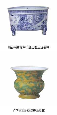 据北京故宫博物院瓷器部主任吕成龙介绍,其中一多半展品为首次公开展出,故宫博物院藏的弘治朝御窑黄地青花折枝花果纹盘、浇黄釉牺耳尊、茄皮紫釉双耳尊、祭蓝釉描金牛纹双耳尊、孔雀绿釉宫碗、正德朝御窑青花阿拉伯文烛台等,景德镇御窑遗址出土、景德镇御窑博物馆藏的孔雀绿地洒蓝锥拱云龙纹盘、青花八思巴文款海水云龙纹盘、五彩团云龙纹碗、白地绿彩锥拱海水云龙纹盘等,都是难得一见的珍品。