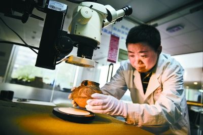 在首都博物馆,研究人员将一件陶罐放置在特殊改装过的体视显微镜下准备进行观察分析。 记者 邓伟摄