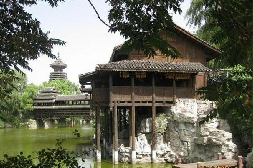 整个园子是把56个民族的传统建筑及当地著名景观按照1:1的比例建造的,因此面积非常大,分南园和北园,为了连接南北园,如过街天桥般修了一座称为“民族大桥”的连接桥,如果不过这座桥,就只能逛一个园子。