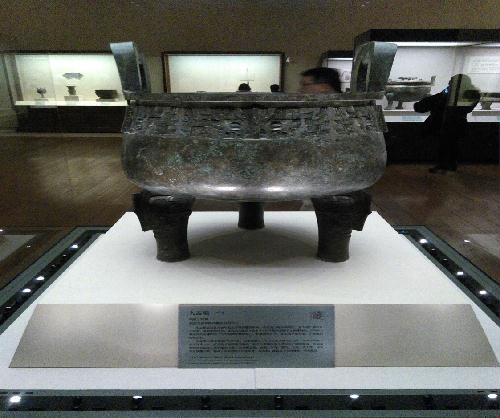 首先我先去看了青铜器展,我看到了琳琅满目的器物。其中,令我影响最为深刻的就属“大盂鼎”。大盂鼎器壁较厚,立耳微外撇,折沿,敛口,腹部横向宽大,壁斜外张,近足外底处曲率较小,成垂腹状,下承三蹄足。整个器形以云雷纹为地,还带有带状饕餮纹,整体造型雄伟凝重。古时候的大鼎还多有铭文,如“王”、“在”、“正”、“土”等字中有许多圆形或方形团块,象形意味仍较浓。
