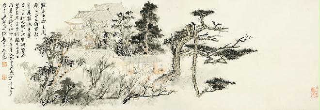1919年张大千拜曾熙、李瑞清为师,学习诗文、书画。二人同时也是著名的鉴赏家,并与上海著名收藏家狄平子、庞莱臣等人交往颇深,加之张大千本人亦热衷收藏书画名迹,因此他得以开阔眼界,长期近距离领会古代绘画中的奥妙。其早期作品以模仿石涛为门径,遍学王蒙、盛懋、吴镇、唐寅、仇英、徐渭、陈淳、陈洪绶、董其昌、弘仁、髡残、八大山人、梅清、任伯年等人。在追摹前人作品时,真正做到了学古、融古、化古,所作“临仿作品”许多都与原作难分真赝,足见他对古人作品的观察之细、领会之深。