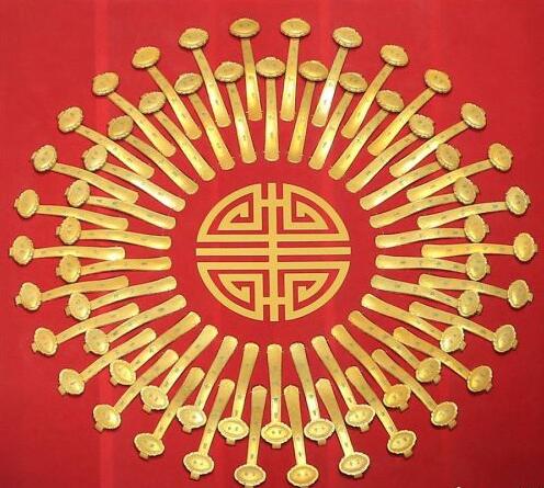 2018北京台春晚,故宫博物院继去年的斗彩鸡缸杯后,再出重宝——八成金累丝嵌绿松石干支纪年如意。舞台上,围成正圆形的60柄金如意是乾隆皇帝60寿辰的寿礼,正合一周甲,共用黄金1361两,可谓“壕”气冲天,2018北京台春晚也希望借此祝全国观众春节快乐,万事如意。