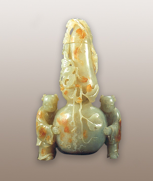 青玉童子葫芦瓶 清(公元1644年-1911年) 通高7.3、底宽10厘米 1967年唐山市文物商店收购 青玉。带盖葫芦形瓶,中空,瓶外壁雕刻有两只爬伏在枝叶上相向的蝙蝠。瓶下部的两侧各有一个梳双髻的童子,作双手抱瓶状。造型生动活泼,具有浓厚的生活气息。