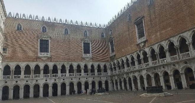 威尼斯总督府又称威尼斯公爵府。始建于9世纪,属于欧洲中世纪哥特建筑。由于当时威尼斯与地中海东部的伊斯兰国家密切的文化贸易往来,大量阿拉伯人定居威尼斯,所以总督府立面的席纹图案明显受到了伊斯兰建筑的影响。