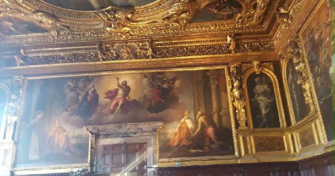 总督府的“大使厅”被精心地装饰得异常豪华。似乎在修建这座大厅的时候,建造者就想让外国人感受到威尼斯共和国的强盛和荣耀。因此,“大使厅”的宏伟规模、屋内家具陈设的豪华和装饰材料的昂贵都能与无价的艺术作品媲美。其中的四幅巨画最为出色:《俯首于圣女、天使和圣者前的元首安德烈·格里特里》,《圣凯瑟琳的订婚仪式》,《永世荣耀的圣女》和《元首莫切尼乔在他的救世主面前》。