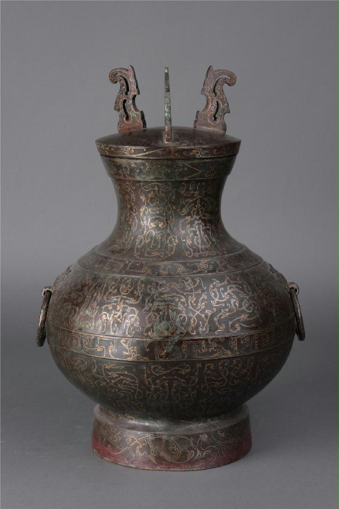 西汉鸟篆文铜壶 【简介】西汉(公元前206年—公元8年) 通高44.2、腹径28.5厘米 1968年满城陵山中山靖王刘胜墓出土 子口盖,环纽。壶口略外侈,鼓腹,高圈足。双铺首衔环。器通体饰鸟篆文吉祥语和动物纹带,文字和图案均有纤细的金银丝双勾错 出。壶盖错铭文“有言三,甫金,为荃盖,错书之”12个字。颈部有 铭文“盖圜四缀,仪尊成壶”8字。 上腹错铭文“盛兄盛味,於心佳都,于”10字。下腹部有铭文“口味,充润血肤,延寿却病,万年有余”14字。铭文连读是一章四言韵文。字体纤细流畅,做工精美。
