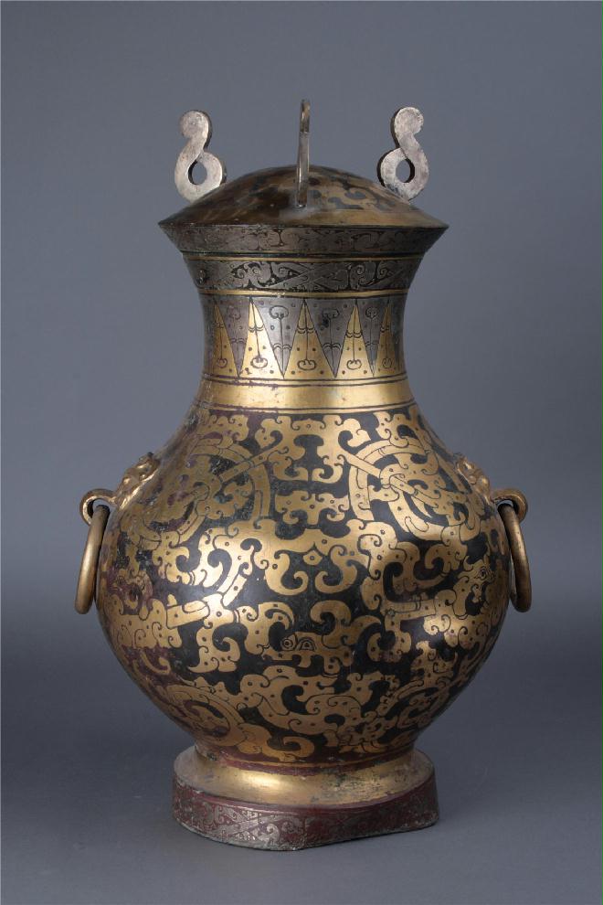 西汉鎏金银蟠龙纹铜壶 【简介】西汉(公元前206年-公元8年) 通高59.5、 腹径37厘米, 重16.25公斤 1968年满城陵山中山靖王刘胜墓出土 壶通体用鎏金、鎏银工艺装饰。 口部和圈足饰鎏银卷云纹带,颈部 饰金银相间的三角纹带,腹部饰四条独首双身的金龙相互翻卷蟠绕, 并缀以金色卷云纹。铺首鎏金。盖面饰鎏金夔凤,盖缘饰鎏银卷云纹,卷云纽鎏银。纹饰金银相映,富丽堂皇。壶内壁髹朱漆一层。壶底刻铭文:“楚大官,槽,容一石□,并重二钧八斤十两,第一”。
