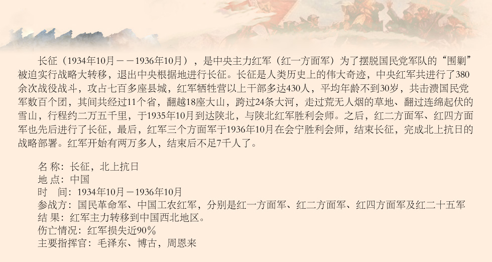 | 从而摆脱了敌人的围追堵截,粉碎了敌人妄图围歼红军于川、黔、滇边境的计划,使中央红军在长征的危急关头,从被动走向主动,从失败走向胜利。四渡赤水是两军最高统帅毛泽东,蒋介石在军事指挥能力上的一次最直接较量,毛,蒋其战略思维的优劣,将直接体现在对... | | 四渡赤水 |